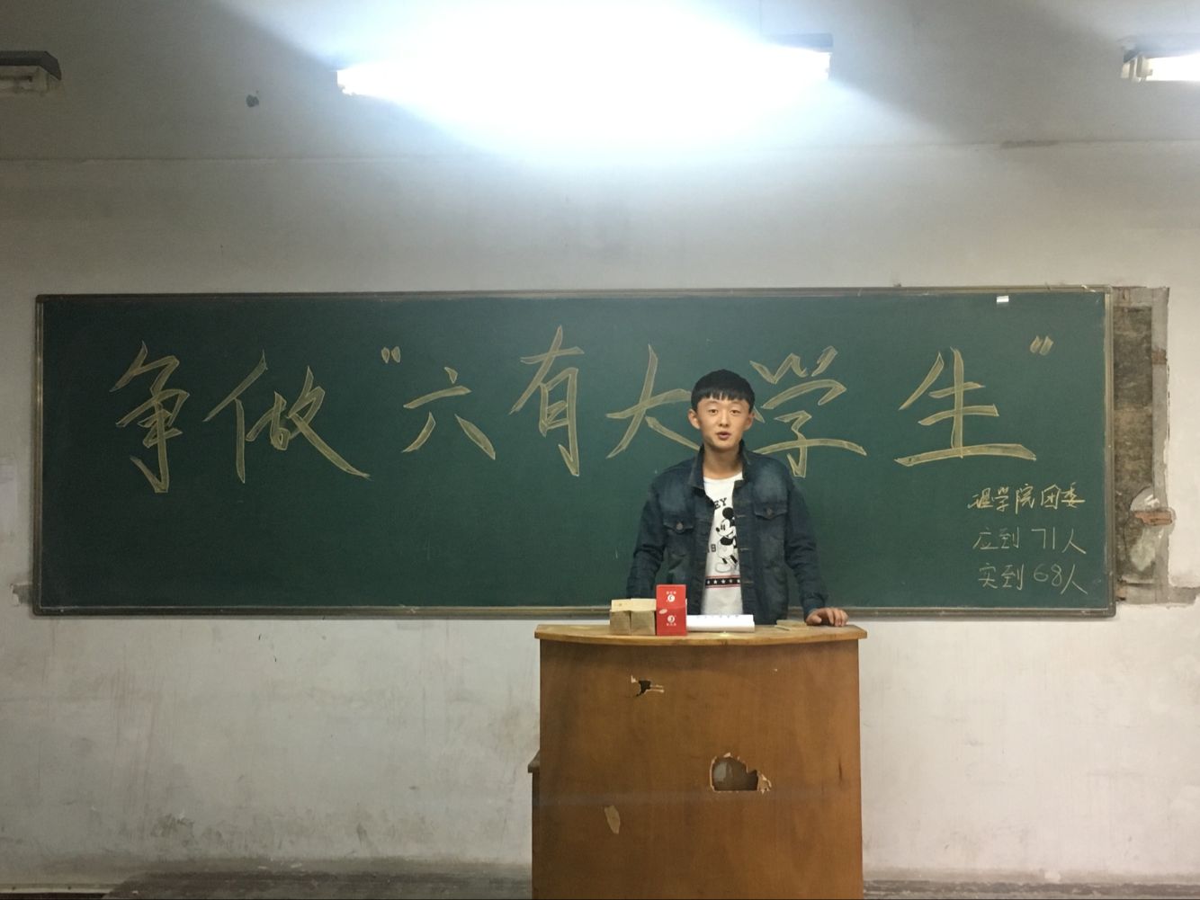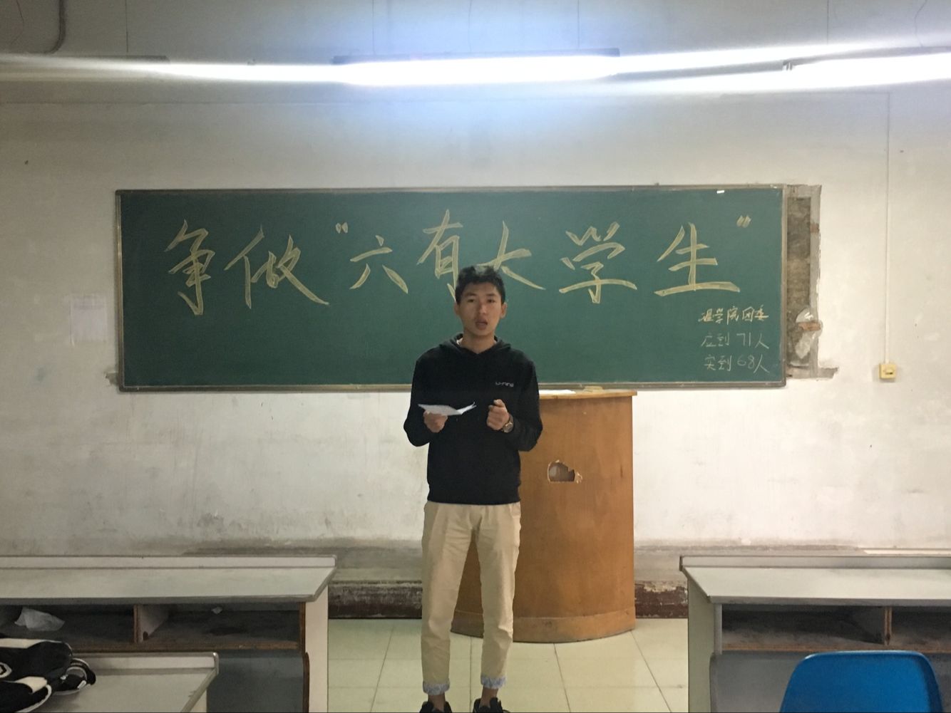 首先,寇帅佳向同学们解释了了何为“六有”大学生,即做一个有理想、有追求、有担当、有作为、有品质、有修养的大学生。首先学生会主席刘亚军发表讲话,他表示大家可以从自己做起,可以先给自己一个小目标,比如考过英语四级,从而带动自己身边的人的学习积极性,影响身边的人。之后团总支副书记朱宗贵对大家提出要求,希望大家可以做到“三入”,即在学风、班风、宿舍文化的建设中要始终秉持“入心、入脑、入行”理念。现代大学生普遍存在六有六无,即有智商,没有智慧;有前途,没有状态;有雄心,没有烈胆;有文化,没有教养;有知识,没有思想;有眼光,没有见识,同学们在今后的学习生活中要做到发扬六有,杜绝六无。