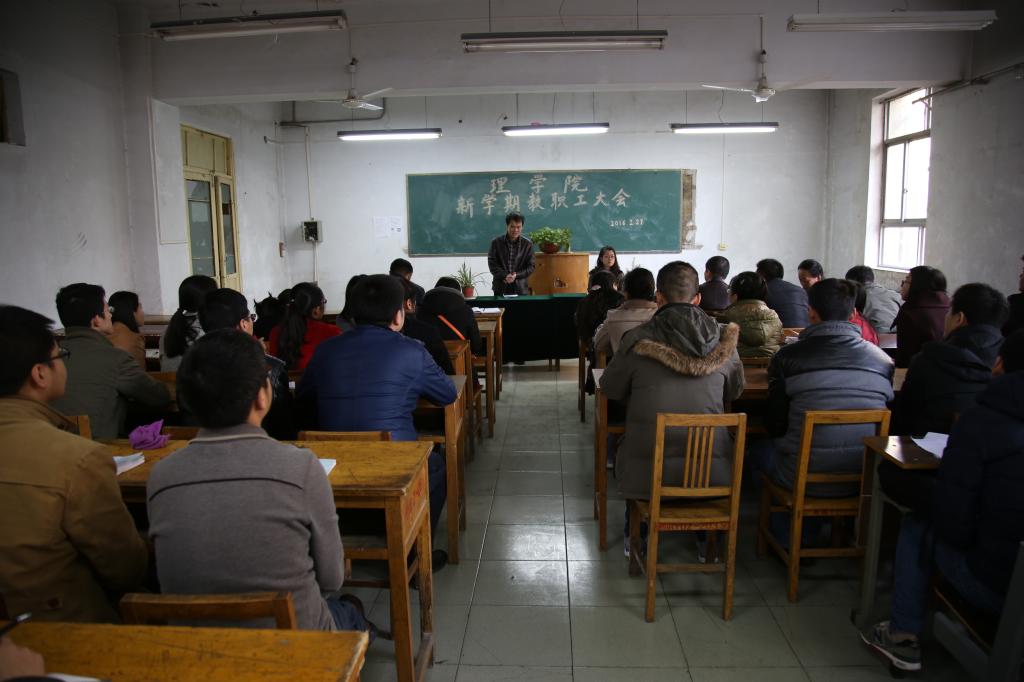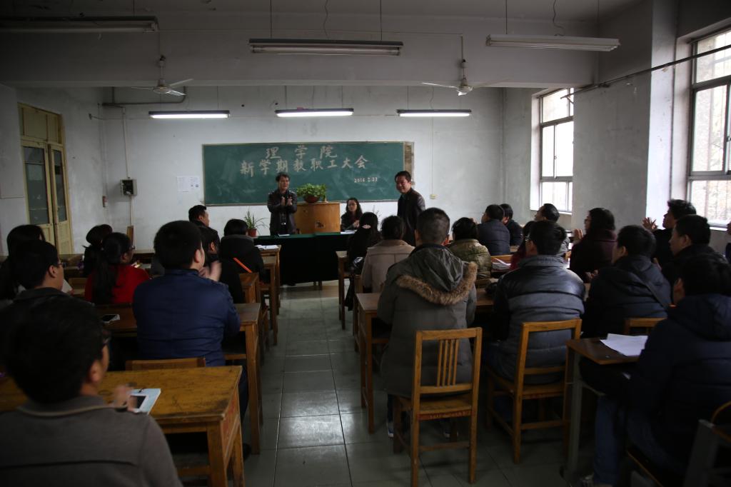 岳忠玉在会上传达了“2016年寒假工作会议”上党委书记陈平社所作的《全省教育工作会议精神》,全面解读了院长陈万强提出的“五个二”------两翼齐飞、两个特色、两个支撑、两个核心、两项评估等寒假干部会议精神,以及Beat365中文官方网站2016年工作要点。他要求广大教师要认真领会陈院长和陈书记的讲话精神,充分认识学校发展中所面临的形势和任务,加大师资队伍建设力度,做好数学类和物理类本科基础课程的课程建设,凝聚学科方向,搭建科研平台,组建科研团队,以学校推行和加强“校院二级管理”为契机,秉承“教授治学、民主办院”的理念,建立健全Beat365中文官方网站规章制度,完善激励约束机制,逐步形成“仁人和合、务实尚理、人尽其材、各美其美”的学院文化,切实做好学校各项工作。