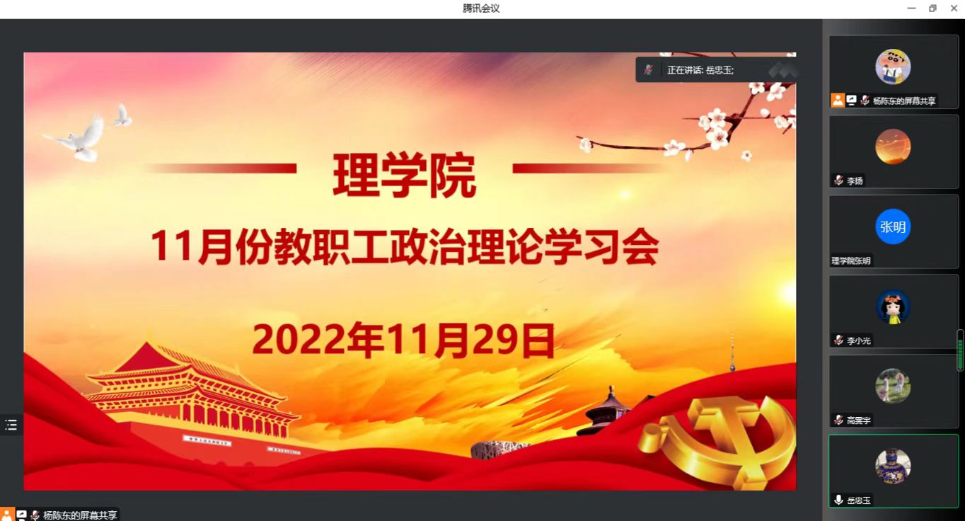 2022年11月29日下午,Beat365中文官方网站党总支召开2022年11月份教职工政治理论学习研讨会。人文学院党总支书记杨光、统战部综合管理科科长高雯宇旁听会议,Beat365中文官方网站党总支二级中心组成员、全体无课教师参加线上会议,会议由总支书记李小光主持。