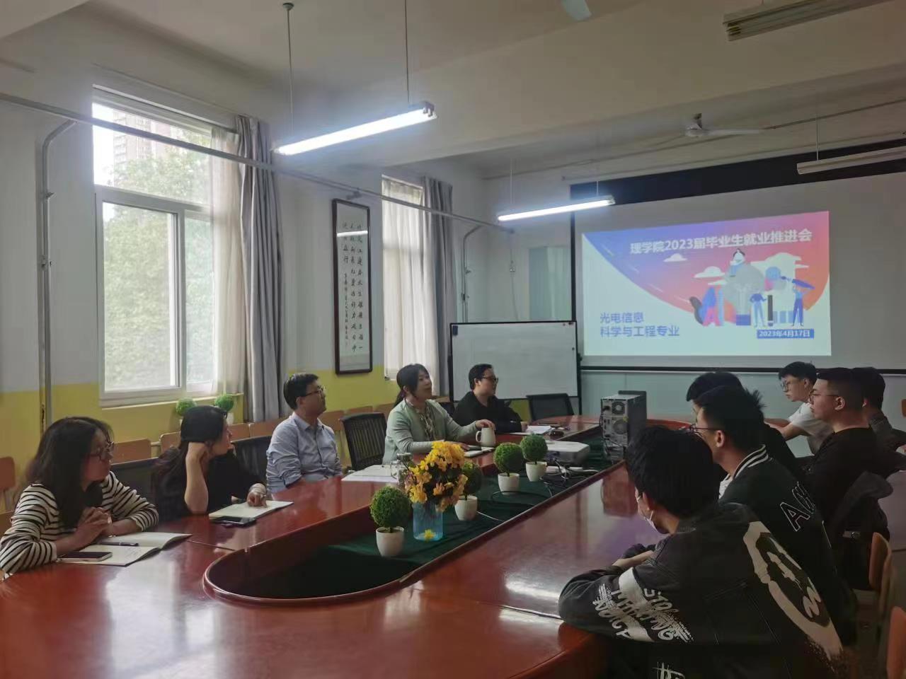 为持续推进2023届毕业生充分就业、帮助未就业学生高质量就业,4月12日和4月17日下午4点,Beat365中文官方网站在教学南楼428会议室分别召开信息与计算科学专业和光电信息科学与工程专业2023届未就业学生就业工作推进会。Beat365中文官方网站党总支书记胡红亮、院长李小光、教研室主任王小梅、周千、专业负责人张惠玲、王妙和学生管理科科长李扬、毕业班辅导员、班主任及2019级未就业学生参加了此次会议。会议由李扬主持。