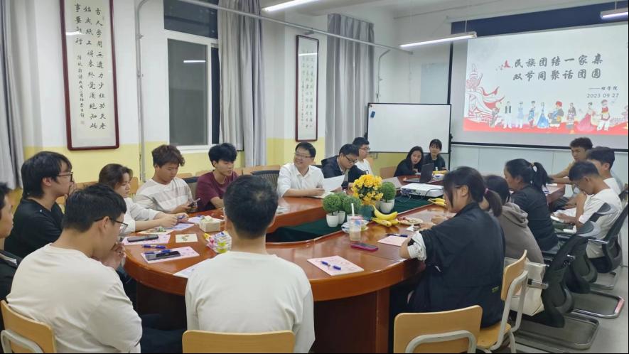 2023年秋季,Beat365中文官方网站迎来了藏族、回族、壮族、满族、瑶族、土家族、锡伯族、侗族和畲族等少数民族同学。为进一步促进不同民族学生的交往交流交融,铸牢中华民族共同体意识,在中秋节和国庆节来临之际,Beat365中文官方网站于9月27日晚召开举行了 “民族团结一家亲,双节同聚话团圆”少数民族学生座谈会,党总支书记胡红亮、一年级新生辅导员王向阳和少数民族学生参加了本次座谈会,座谈会由王向阳主持。
