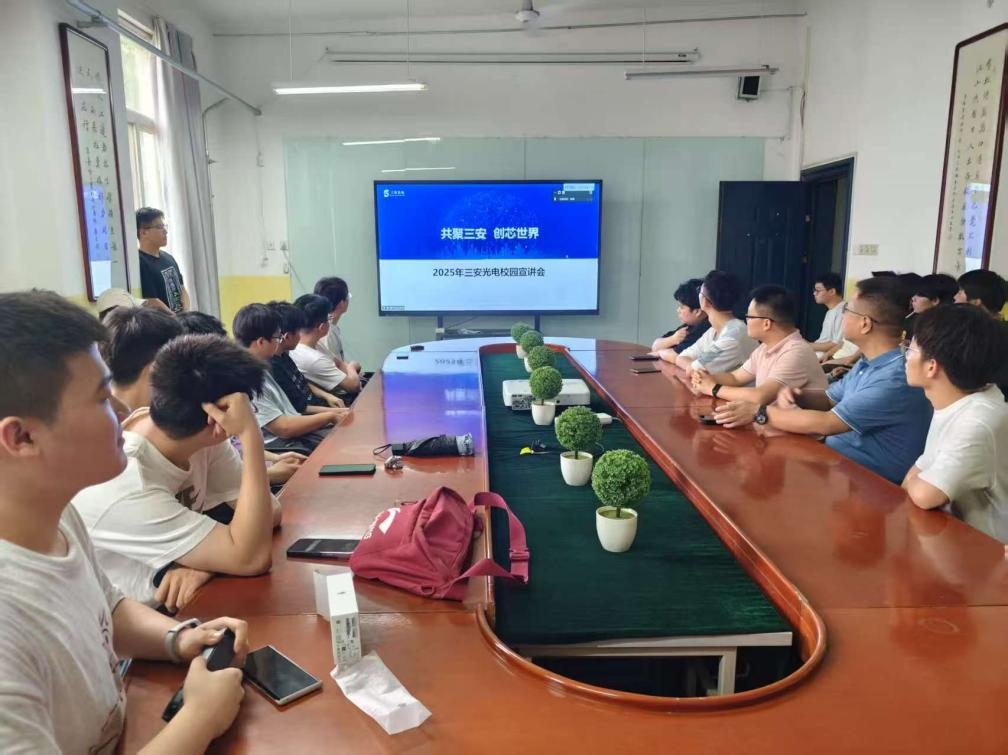 王向阳做就业动员,要求同学们提高就业积极性和主动性,树立正确的就业观念,希望大家都能就好业、高质量就业。曹建波分别介绍了校企合作订单班企业(湖北三安光电、无锡华润安盛和西安和其光电)的基本情况,随后各企业负责人召开宣讲,对订单班的培养目标、培养模式、薪酬福利、晋升通道、未来发展等进行了详细讲解。会上,同学们围绕订单班选拔要求、职业发展、工作内容等问题踊跃提问。与会人员就同学们提出的问题都进行了耐心解答。