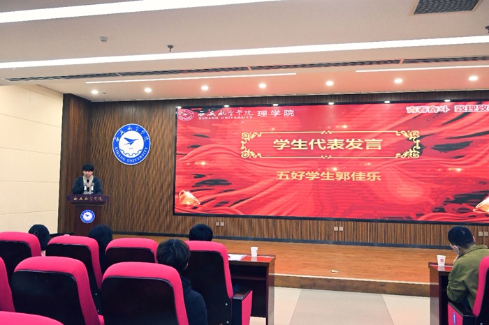 作为青春榜样,五好学生郭佳乐作为获奖学生代表发言。他结合自身学习成长经历,分享了在学业钻研、科技创新、社会实践中的体会与收获,表达了对学院培养和老师教诲的感激之情,并倡议全体同学珍惜时光、勤学笃行、勇攀高峰,努力成长为可堪大任的时代新人。