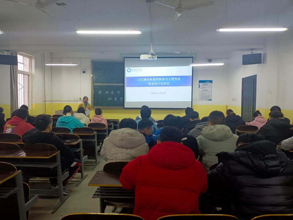 2022届光电信息科学与工程专业毕业生于2021年11月15日在南楼209教室开展了毕业设计动员会,本次会议由光电信息科学与工程专业负责人王妙组织并主持召开,光电信息181班全体同学参加。