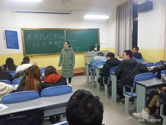 各班主任就目前具体形势给大家做一分析,建议有同学们元旦期间非必要不外出,不去人群密集的场所,为了自身的安全与社会的稳定,积极配合防疫行动;强调同学们应自觉约束自己,按时打卡汇报自己当天身体情况和所在方位,在抗疫的冲刺阶段齐心协力,保护自身的安全;在校在家都要注意水电安全,谨防一氧化碳中毒;鼓励同学们少外出聚会,湿度锻炼,多看书多学习,尽量在假期做好英语考级的准备。