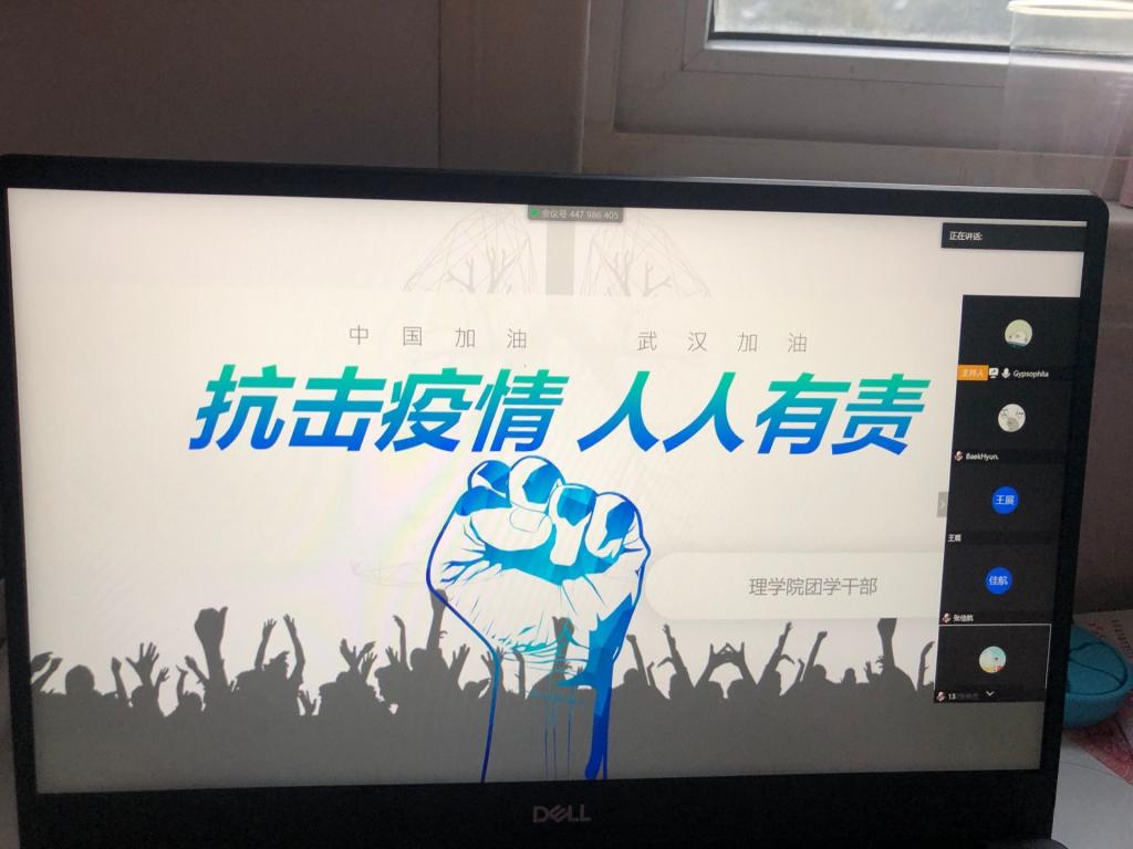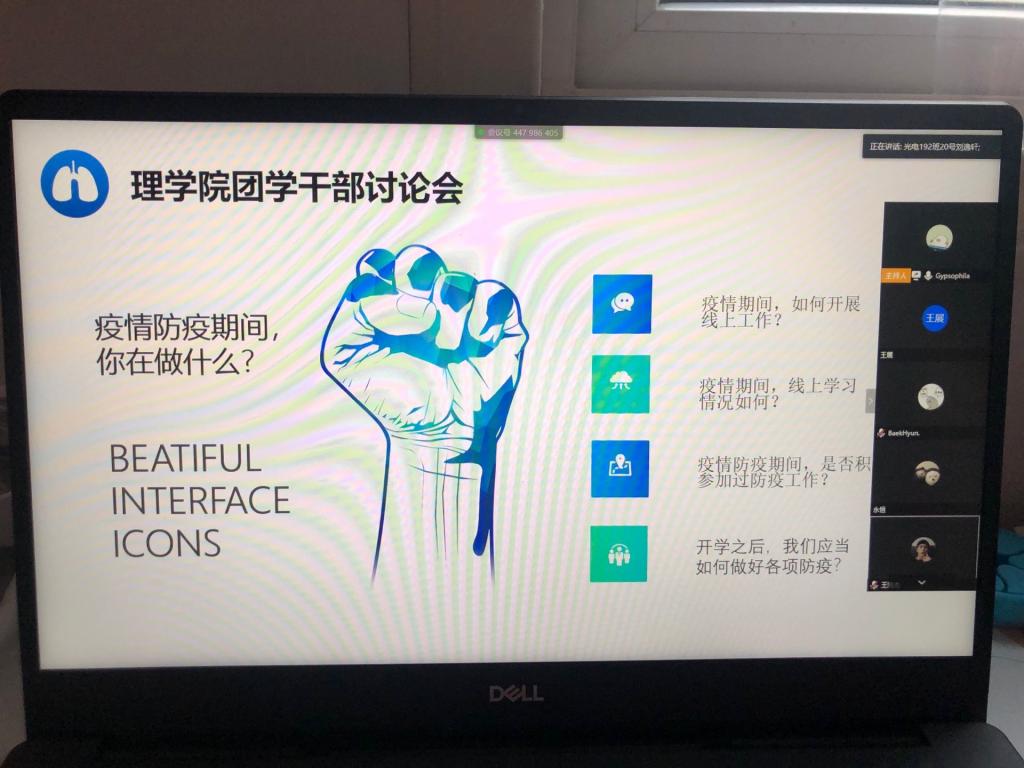 2020年3月19日晚18时,在受到全国疫情影响,学校停课不停学情况下,Beat365中文官方网站团学组织召开了新学期第一次视频会议。参加会议的有Beat365中文官方网站学生管理科科长李扬、团总支书记杨陈东及全体团学干部。会议由Beat365中文官方网站团总支副书记唐紫怡主持,会议主题是“抗击疫情、人人有责”,主要围绕疫情防疫期间同学们、特别是学生干部们应该做什么、怎么做而展开讨论。