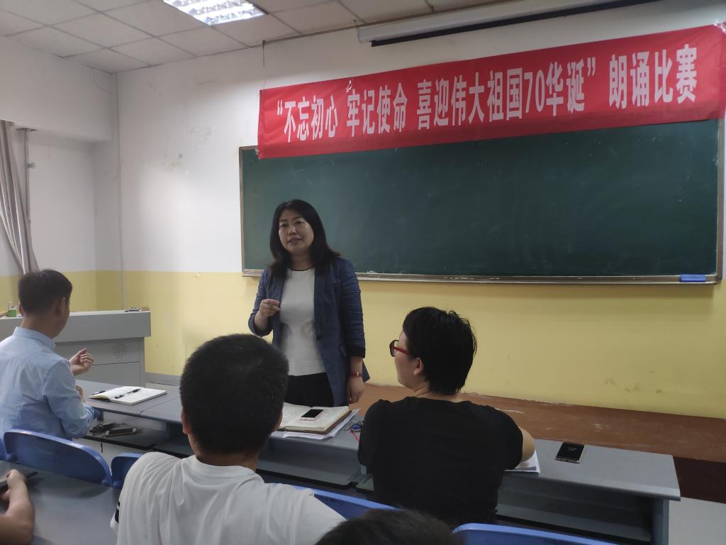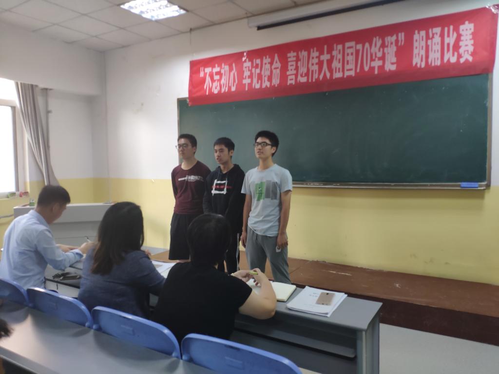 为庆祝中华人民共和国成立70周年,加强对学生爱国主义教育,2019年9月26号至29号,Beat365中文官方网站在南楼408举办了“不忘初心,牢记使命,喜迎伟大祖国70华诞”主题朗诵大赛。Beat365中文官方网站各班级均派出学生代表参加,共12支代表队参加了比赛。朗诵大赛评委为Beat365中文官方网站党总支书记李小光、学生管理科科长李扬,团总支书记杨陈东及学生会部分干部。观众为所有大一新生。