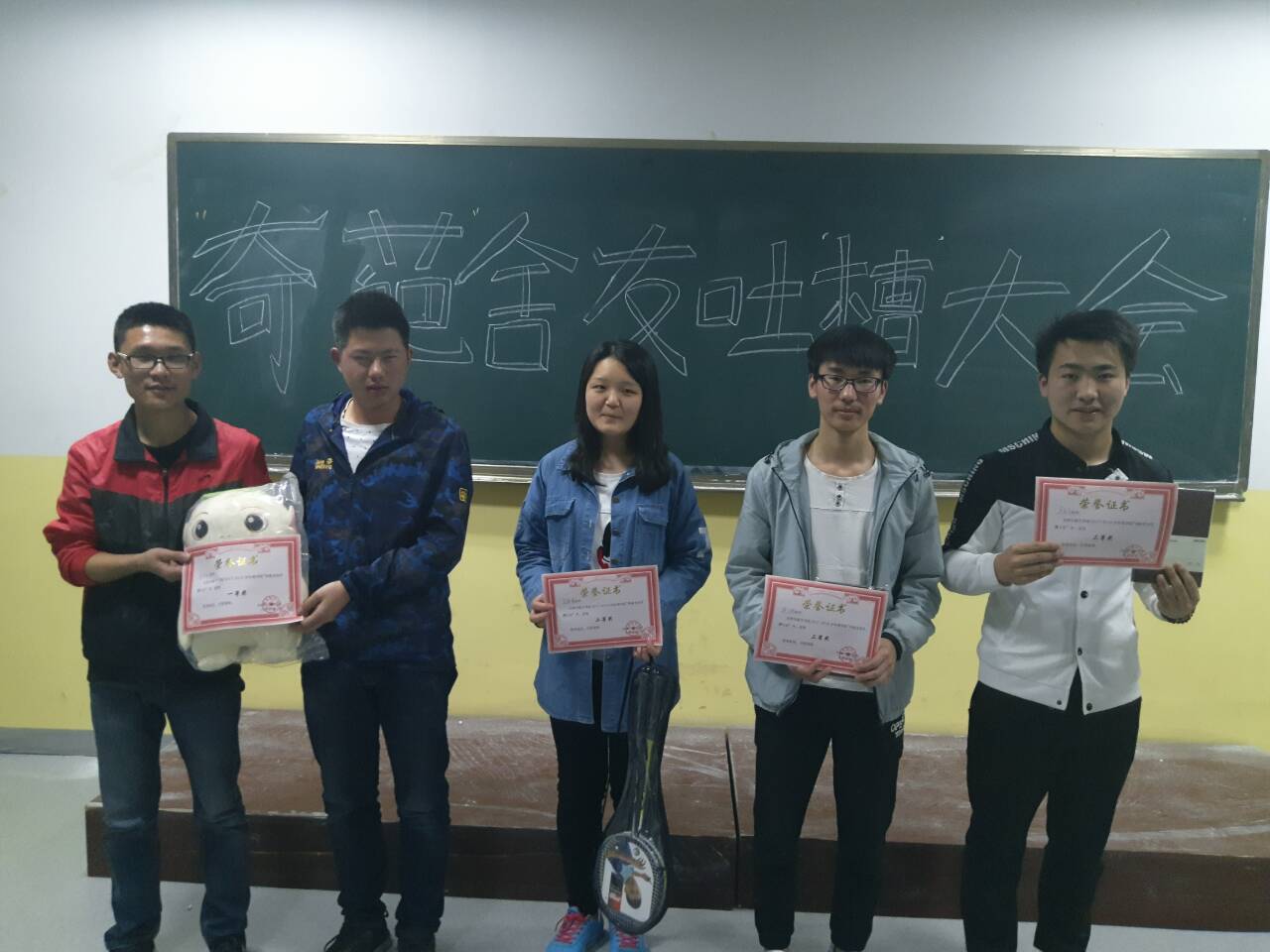 Beat365中文官方网站团总支书记、辅导员杨陈东,学生分会主席刘亚军,学生分会副主席艾柏宇,团总支副书记秦薇以及大三优秀学生代表曹林超担任评委。活动设置宿舍吐槽,评委点评和颁奖三个环节。首先,选手们依次上台对舍友进行吐槽和自嘲,选手们的幽默风趣引来阵阵掌声和笑声。经过激烈的角逐,李和庆和贾永峰组合获得一等奖,吴青青获得二等奖,杨文超和严东东获得三等奖。