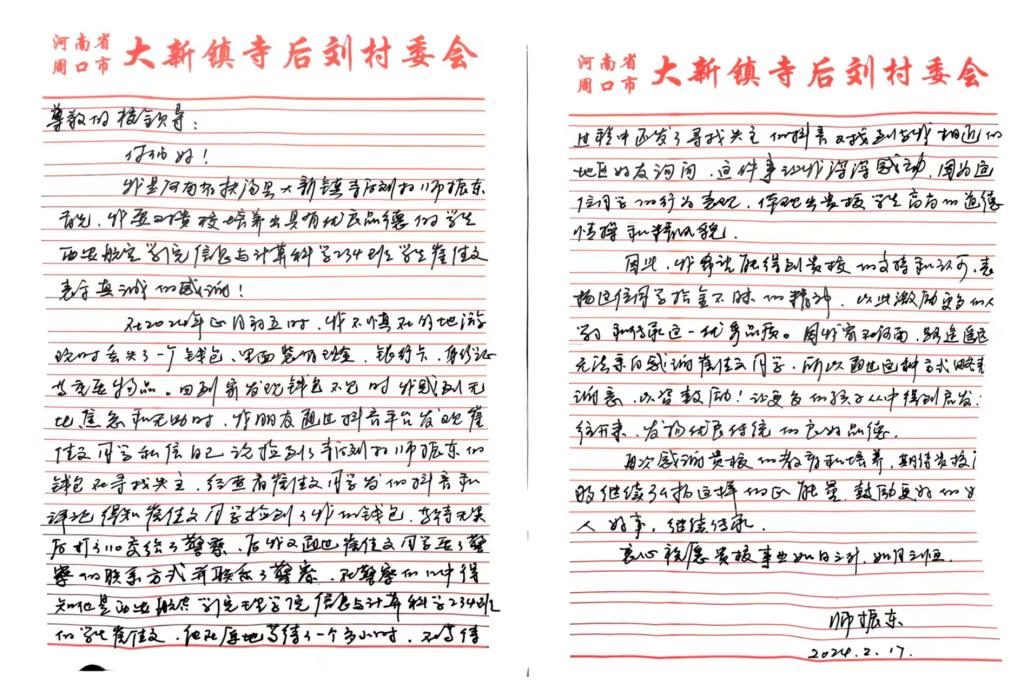 近日Beat365中文官方网站学生工作办公室收到了一封来自河南省周口市的感谢信。信中对Beat365官网信息计算234班崔佳文同学春节假期期间拾金不昧的行为表示诚挚的感谢,失主充分肯定了崔佳文同学这种拾金不昧、助人为乐的雷锋精神,由衷地感谢学校培育出这样优秀的学生,并对学校良好的育人氛围和德育工作给予了高度评价,在感谢信末尾衷心祝愿Beat365官网事业如日之升,如月之恒。