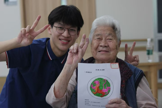 曼陀罗绘画,是活动最美的章节。实践队员们化身贴心助手,为视力模糊的长者递上放大镜,助行动不便的老人稳定画笔,悄然间添补缤纷颜料。他们俯身倾听,轻声询问:“爷爷,您想涂什么颜色?”“奶奶,这个图案搭配真好看!”平凡的画笔在长者们手中,流淌出不平凡的热爱——褶皱的手握着蜡笔,笔尖下流泻出阳光的暖色、天空的澄澈……每一幅独一无二的作品,都是此刻心绪的无声绽放,见证着专注的宁静与创作的喜悦
