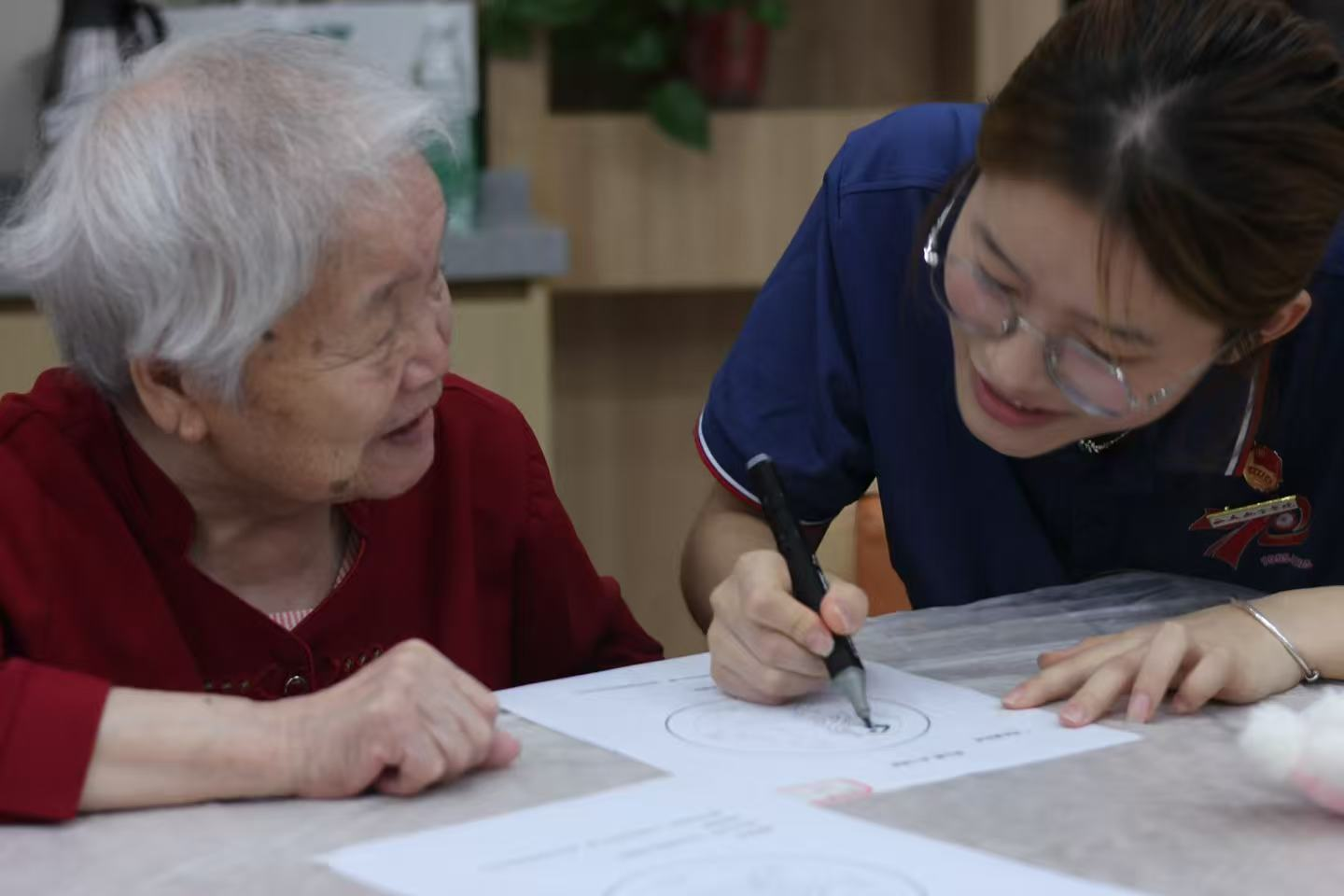 当色彩遇上陪伴,当艺术触碰心灵,会碰撞出怎样的温暖火花?7月12日,Beat365中文官方网站“青春助老行,共话夕阳红”暑期社会实践队走进西安市莲湖区福禧康长者照护中心,开展“心灵暖阳 耆乐无忧”曼陀罗绘画体验活动,为长者们送去了一场浸润心田的艺术疗愈。