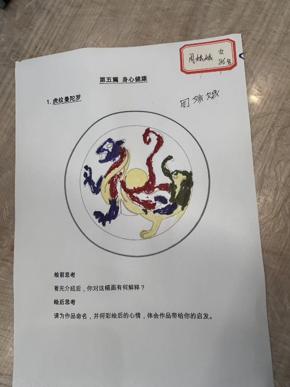 分享环节,情感的暖流在此汇聚。长者们骄傲展示着作品,为它们赋予如生命的名字:“生龙活虎”、“虎气冲天”、“飞虎上天”、“可爱的公老虎”……这些充满力量与童真的命名,饱含着对生活的无限热忱。队员们专注倾听,认真记录下那些沉淀的时光感言:有追忆似水年华的激情,有沉浸当下的内心安宁,更有跨越空间对亲人的深沉牵念与祝福。无声的点头,理解的微笑,搭建起跨代的心灵共鸣。