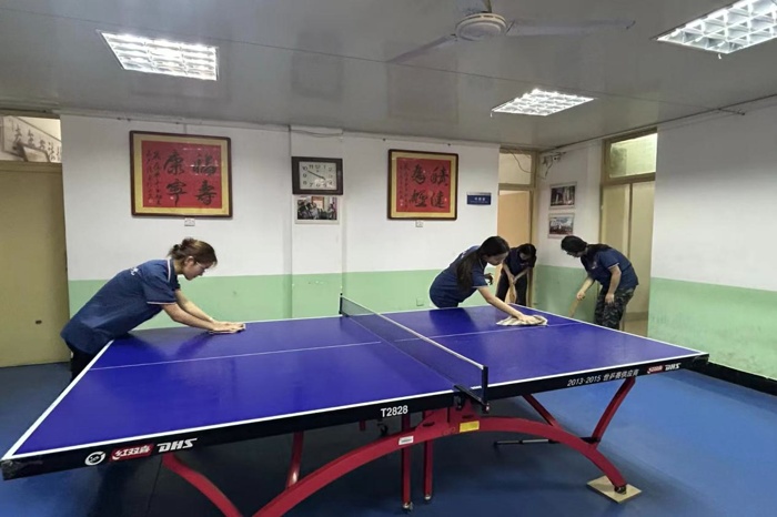 健康活动余韵未消,实践队员们服务的热忱更炽。他们随即拿起扫帚抹布,主动投入清扫。转眼间,乒乓球台光可鉴人,棋牌室桌椅井然有序,窗明几净的办公室映出队员们忙碌的身影与灿烂阳光。闷热空气里,汗水浸湿衣衫,却无人言倦。望着焕然一新的活动场地,想象老教师未来在此更舒适地相聚交流,队员们脸上漾满欣慰。 “孩子们真麻利!” 路过的老教师由衷赞叹。这方用汗水换来的洁净天地,正是学子们献给老教师的又一份“舒心家园”心意。