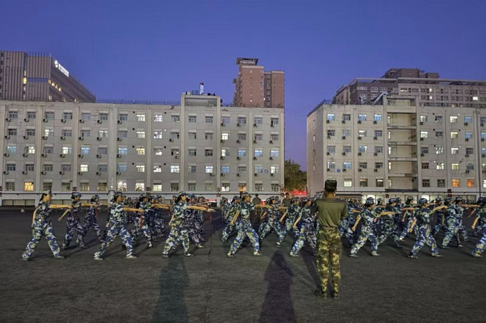 而在不远处的匕首操方阵训练区域,同样是一片热火朝天的景象。新生们手持特制的训练匕首,目光坚定,精神抖擞。在教官的口令声中,他们熟练地完成着一个个动作,从持匕姿势到刺、挑、劈、砍等攻击动作,再到转身、移步等战术动作,每一个细节都处理得恰到好处。当全体成员齐声喊出“杀!杀!”的口号时,那震天的气势仿佛要将一切困难都踩在脚下。