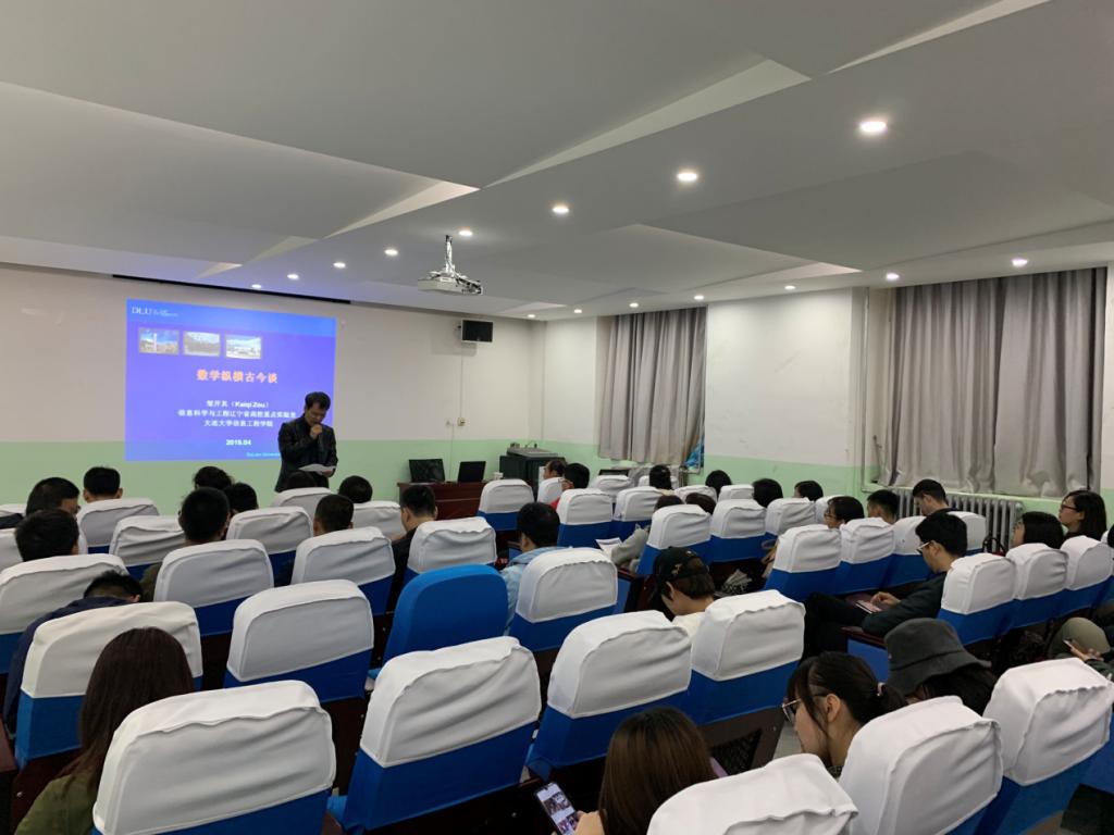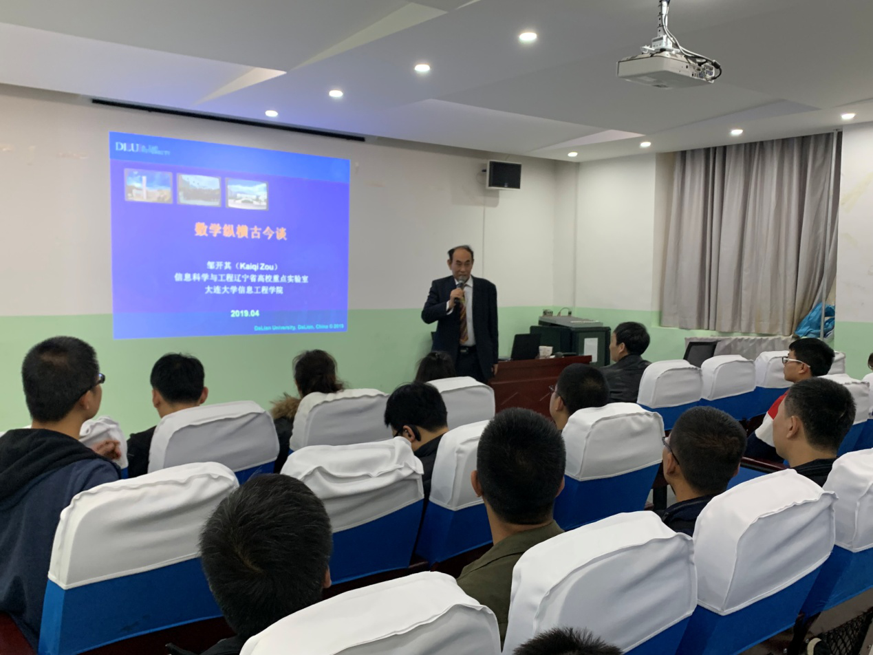 2019年4月12日下午2:30,Beat365中文官方网站邀请大连大学学术梯队带头人、大连大学应用数学研究所所长邹开其教授在教学南楼108做了题为“数学纵横古今谈”的学术讲座。讲座由Beat365中文官方网站院长岳忠玉主持,近百名师生参加。