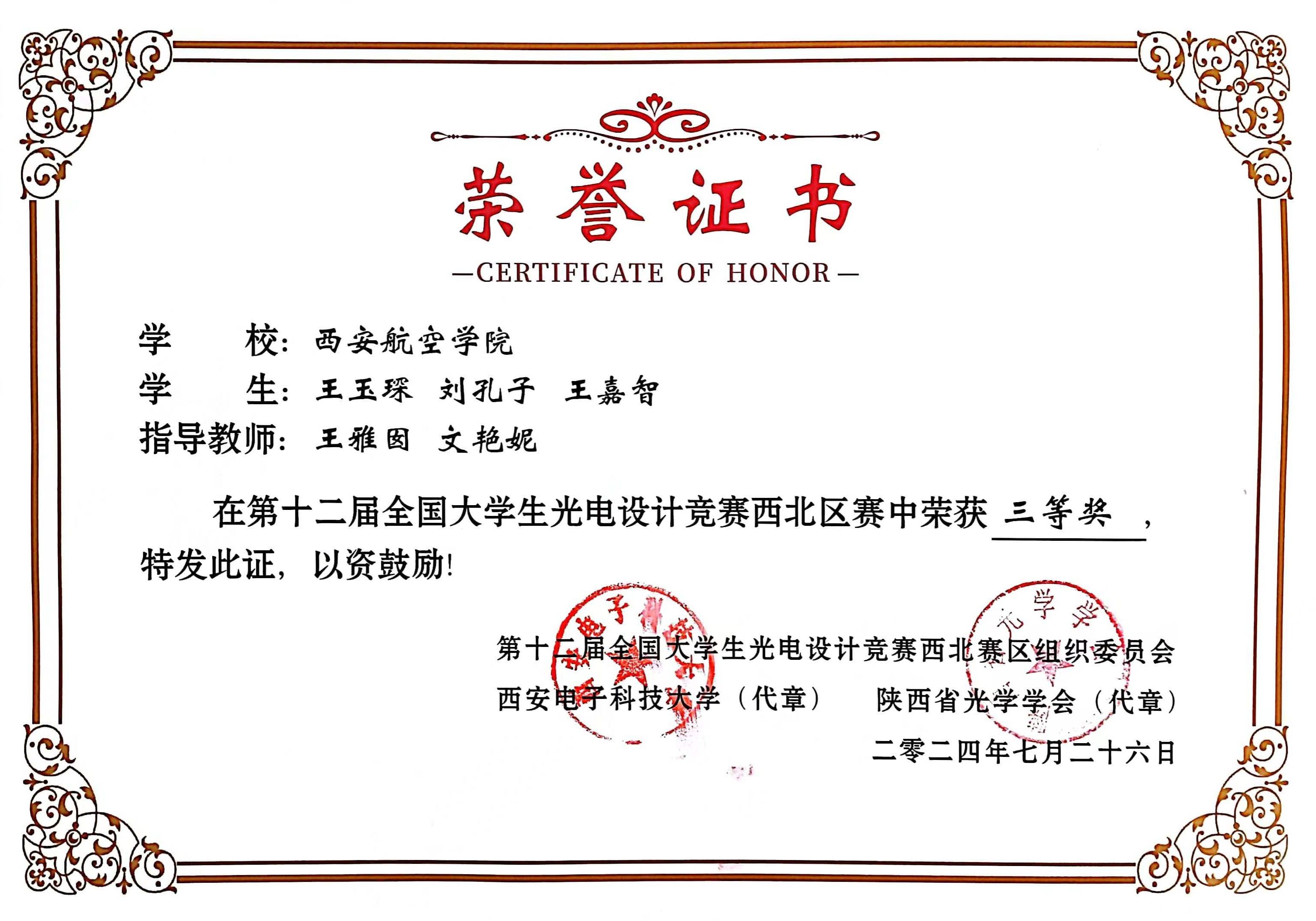 第十二届全国大学生光电设计竞赛(西北赛区)于7-8月在西安电子科技大学隆重举行。本次竞赛以“光电引领、未来可期”为主题,西北地区共有46所高校的524支队伍、1998名师生报名参赛,经过初赛、决赛现场答辩等环节的激烈角逐,学校荣获西北赛区二等奖、三等奖各1项。“全国大学生光电设计竞赛”是由中国光学学会主办、中国光学学会光学教育专业委员会代表主办机构、全国大学生光电设计竞赛委员会具体负责的一项全国高校光电类专业重要的学科竞赛赛事。