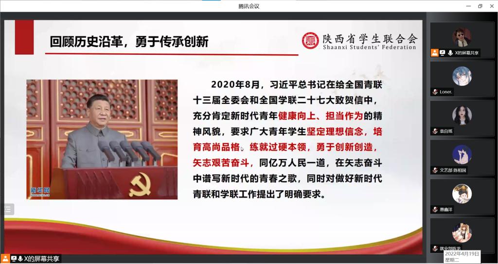 2022年4月19日晚19点30分,Beat365中文官方网站于线上召开2022年春季学期学生骨干集体培训会议,Beat365中文官方网站团总支书记、辅导员张岩和全体团学干部参加了本次会议,会议由许高博主持。