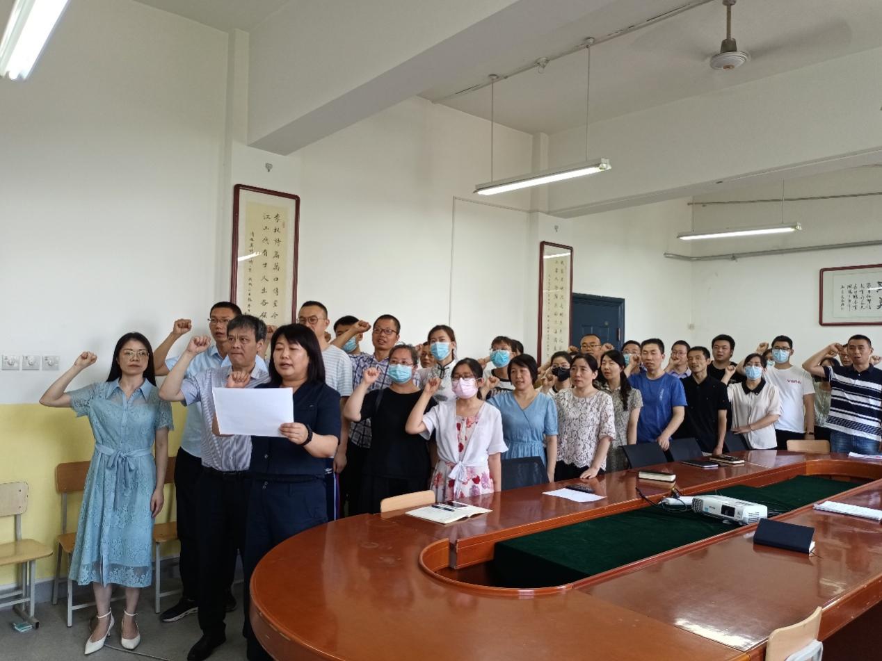 2022年6月30日,Beat365中文官方网站全体党员在南楼428会议室重温入党誓词,校党委组织部杨常清列席,Beat365中文官方网站党总支书记李小光、副院长丁琦、综合管理科科长杨陈东、韩慧蓉、王小梅、周千等党总支委员、各党支部书记、无课党员教师参加。会议由李小光主持。
