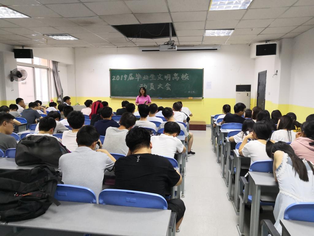 为提高毕业生文明离校意识,做好毕业生文明离校工作,6月13日19点30分,Beat365中文官方网站在南楼408教室召开了2019届毕业生文明离校动员大会。Beat365中文官方网站党总支书记李小光、学生管理科科长李扬、辅导员杨陈东和全体2019届毕业生参加了会议。会议由李扬主持。